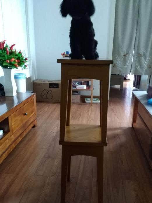 于是主人就想了一招,主人用两个凳子摞起来,然后将狗狗放在凳子上边,狗狗还是比较胆小的,所以在凳子上一动不动,网友看后直呼:真绝!